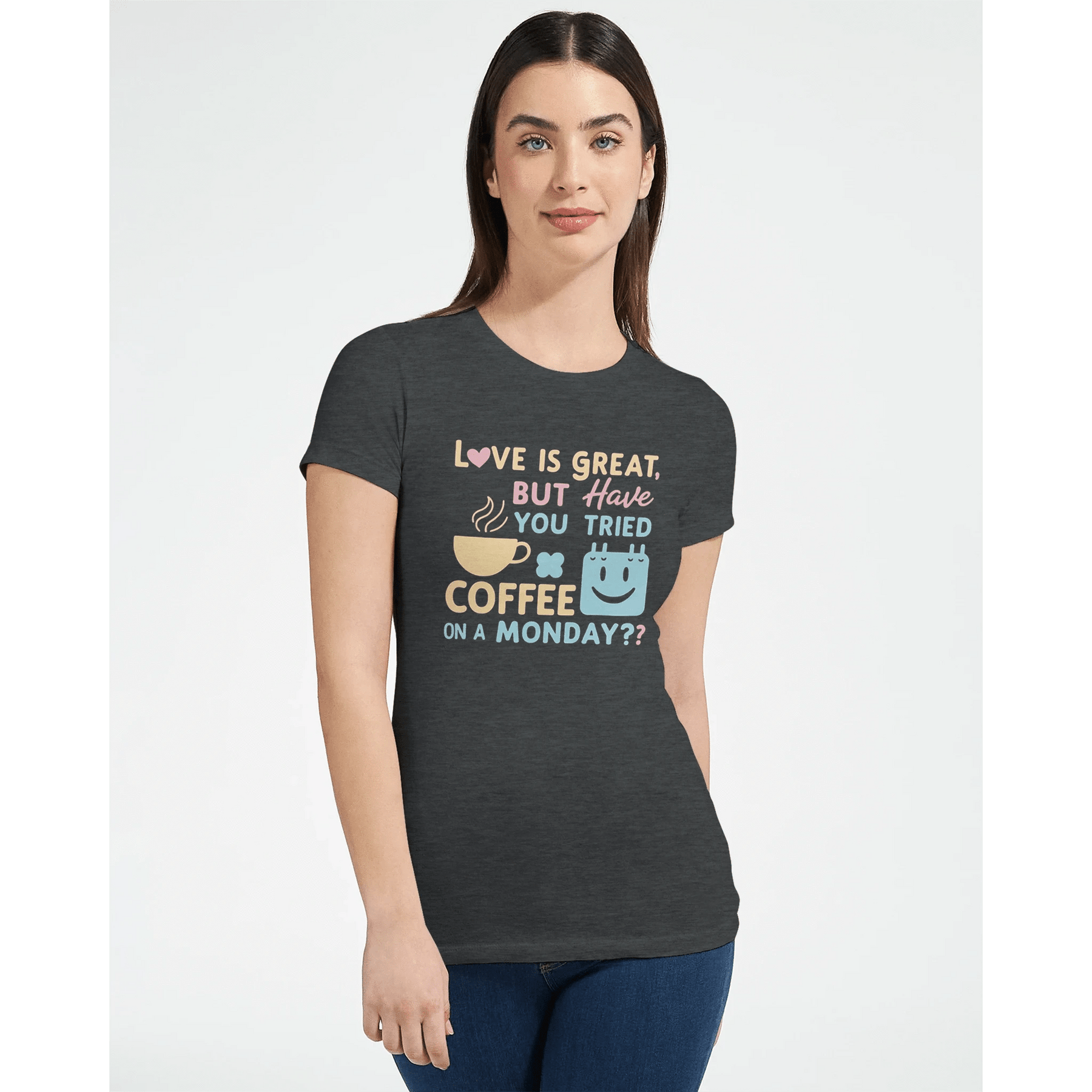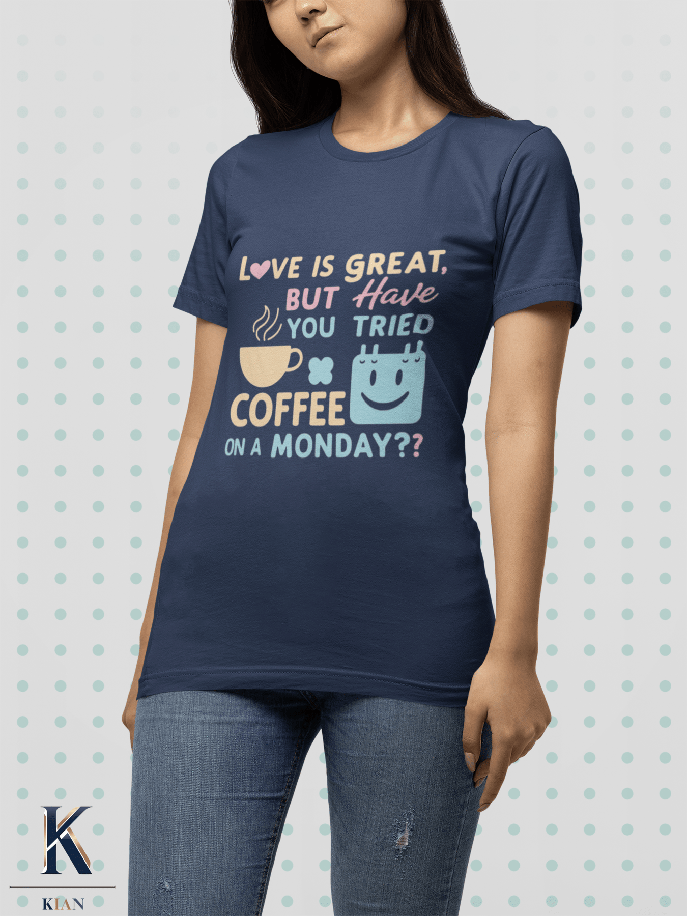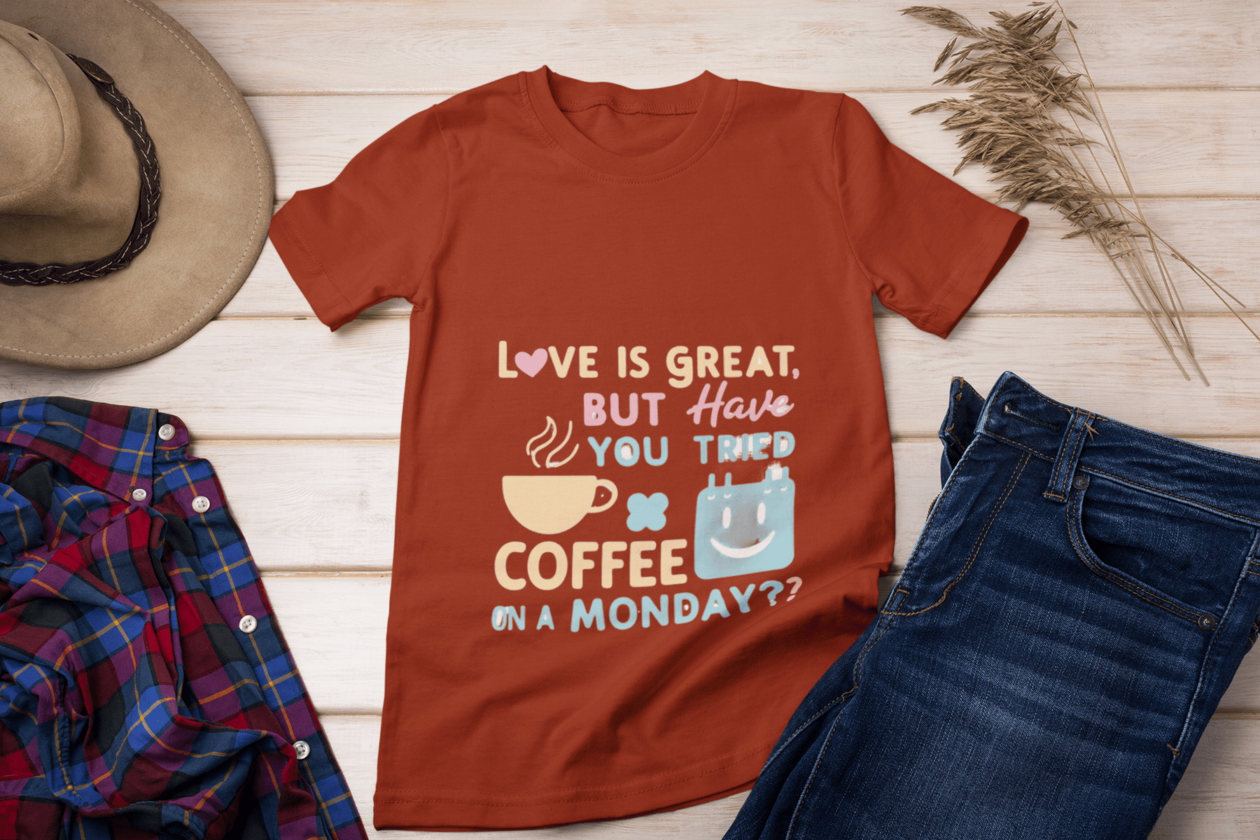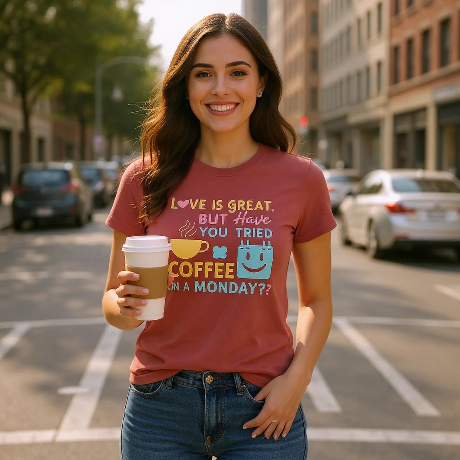 Start your week with a smile (and a cup of coffee) in our “Love is Great, But Have You Tried Coffee on a Monday?” T-shirt. This soft, comfy tee is perfect for coffee lovers who know that Mondays need more than just love—they need caffeine!