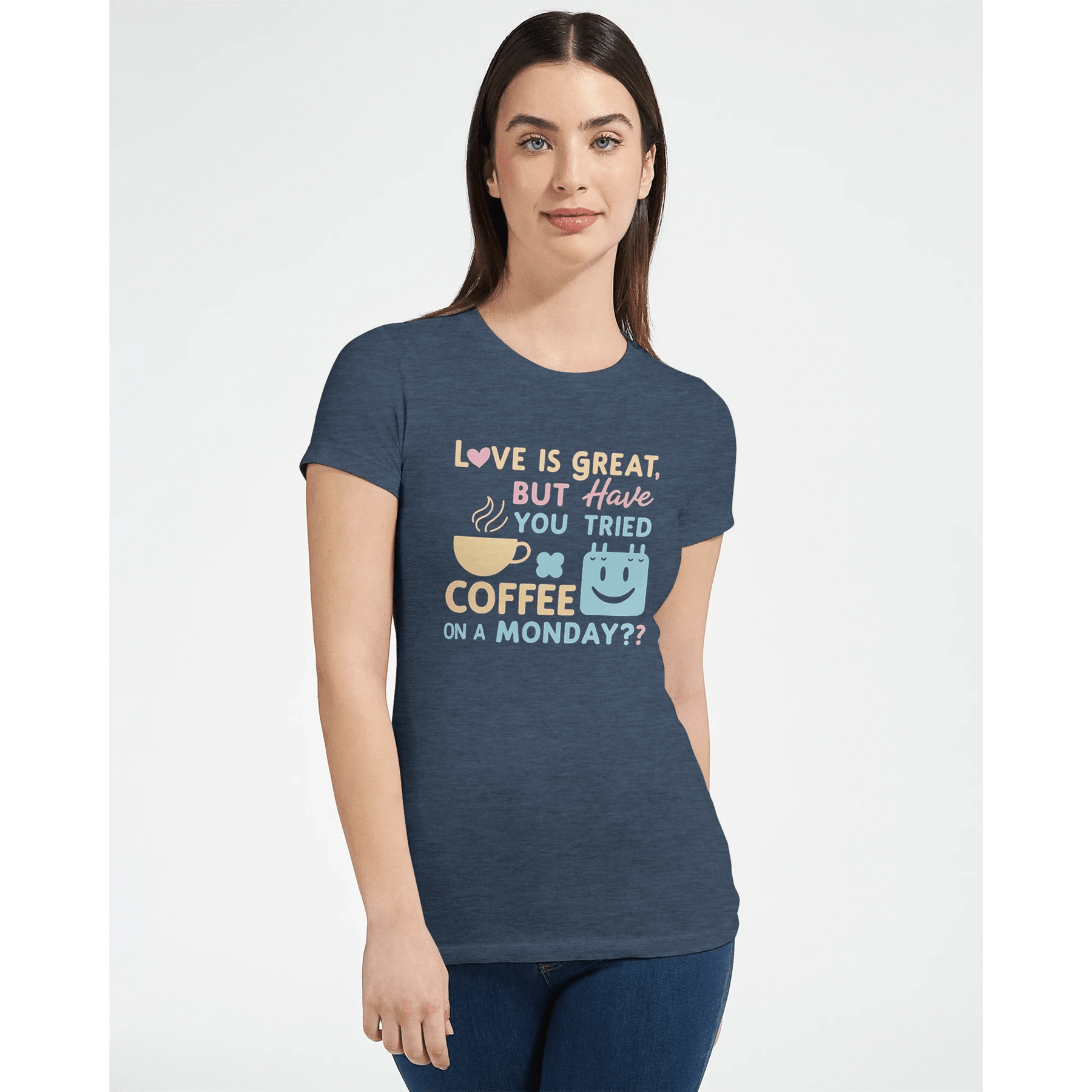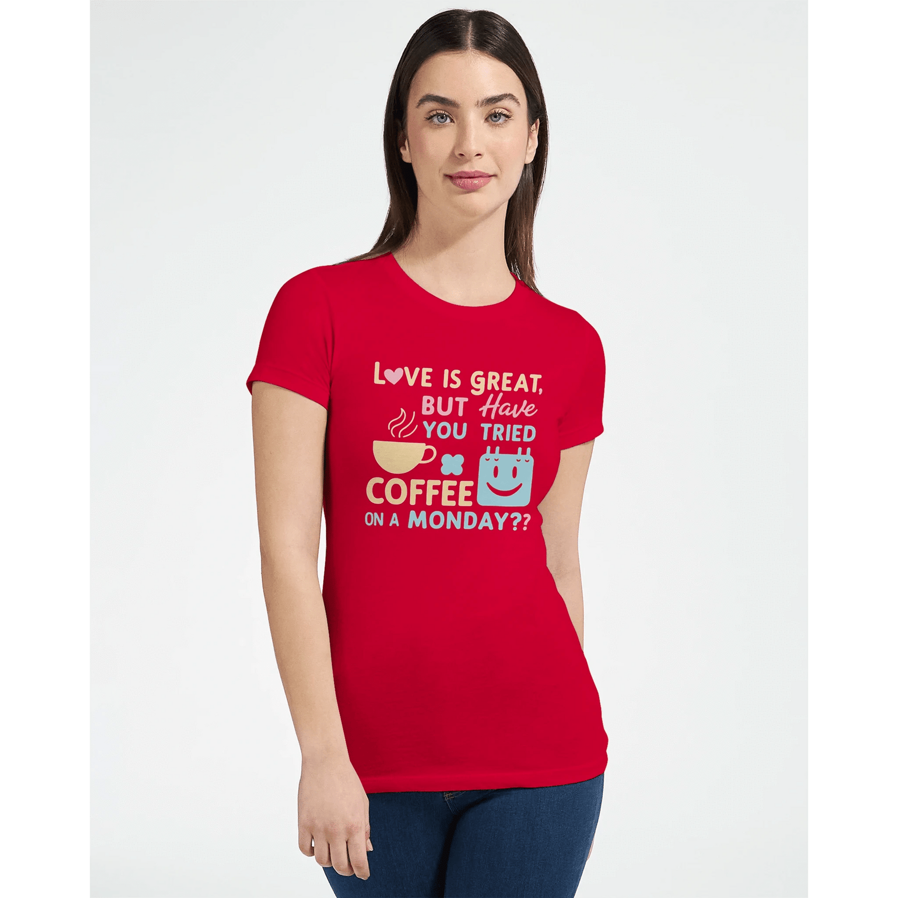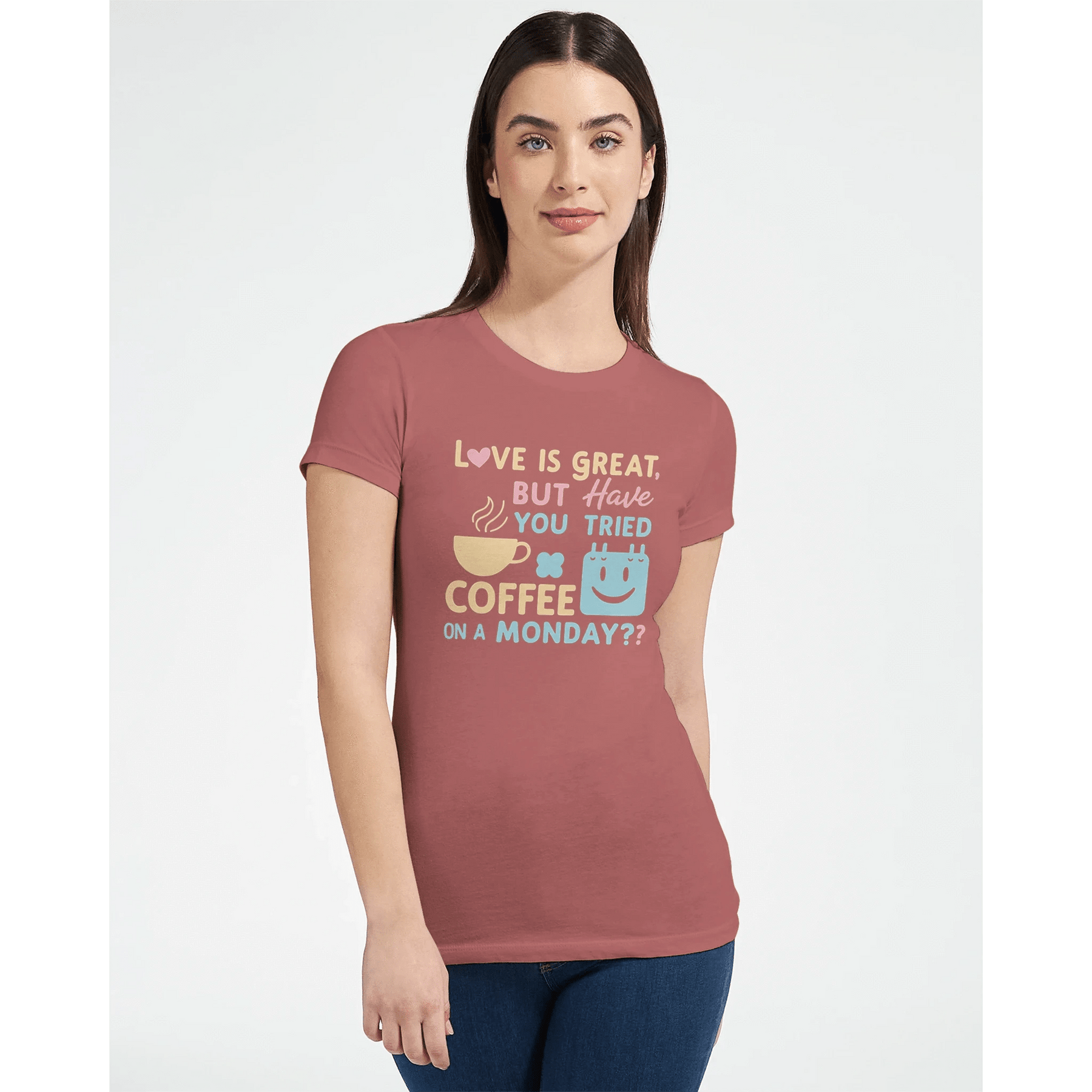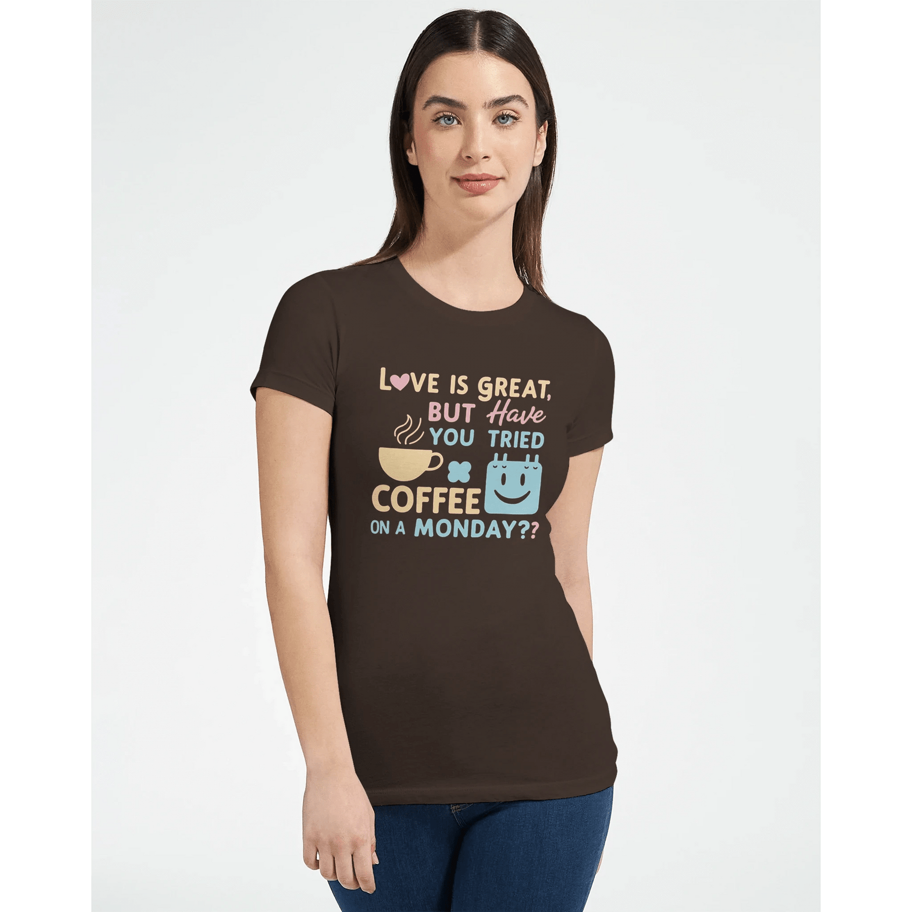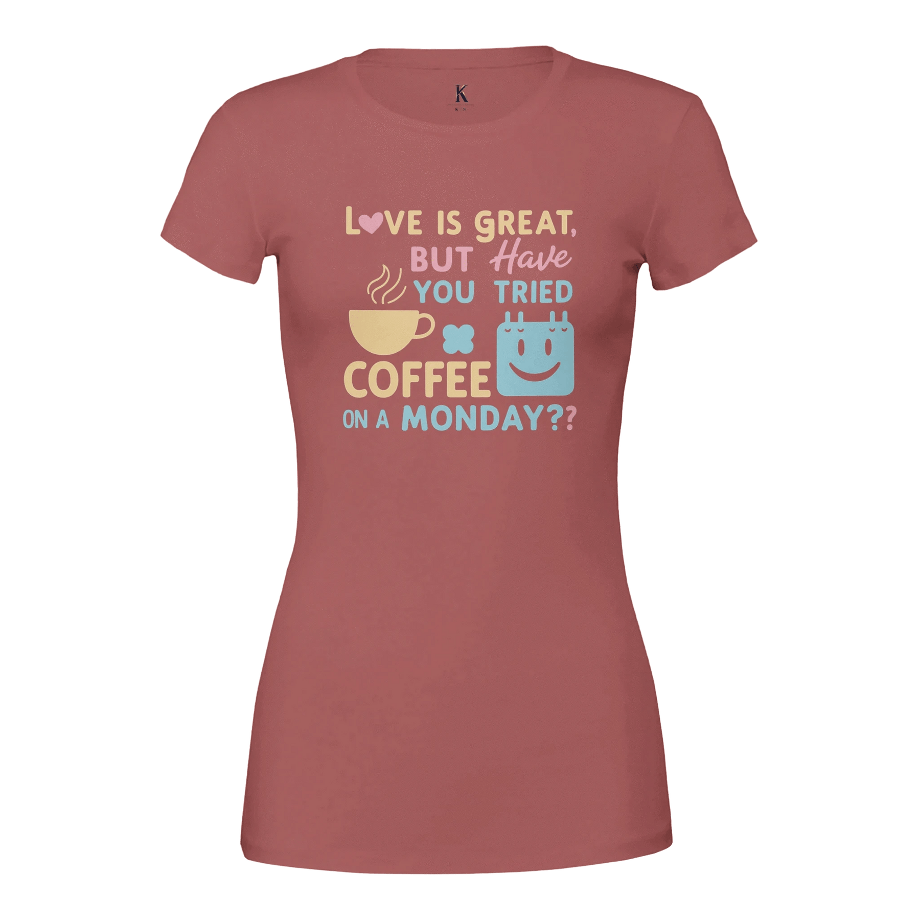 Start your week with a smile (and a cup of coffee) in our “Love is Great, But Have You Tried Coffee on a Monday?” T-shirt. This soft, comfy tee is perfect for coffee lovers who know that Mondays need more than just love—they need caffeine!
