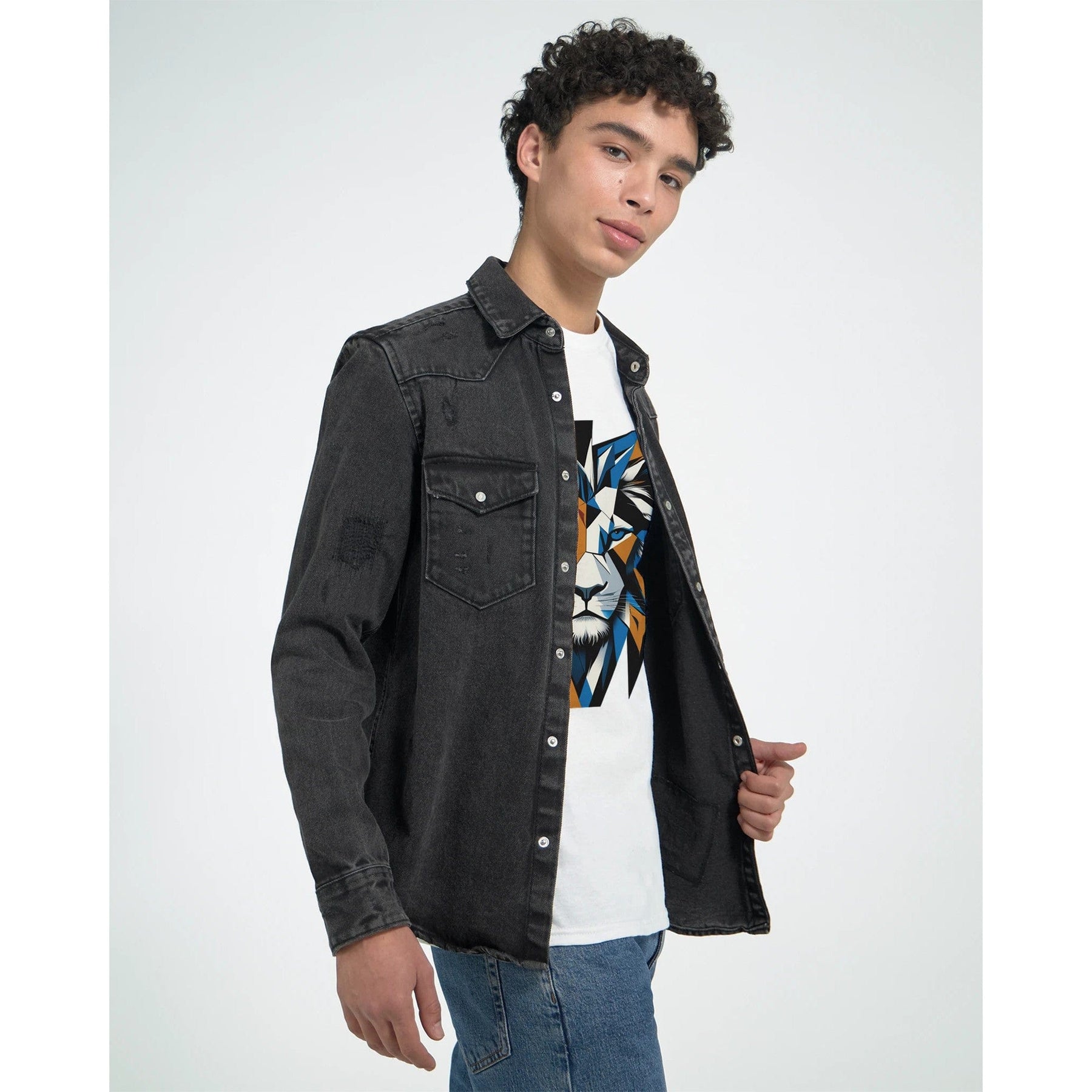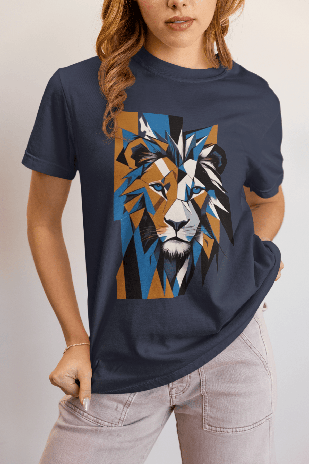 Make a statement without saying a word. This bold geometric lion T-shirt blends modern art with wildlife inspiration. Featuring a striking lion face in vibrant blue, gold, and black abstract shapes, this design is perfect for anyone who loves powerful, artistic style. Soft, breathable cotton and a relaxed unisex fit make it ideal for casual outfits, creative workspaces, or gifting to the fierce souls in your life. Whether you’re channeling strength, courage, or just love unique graphic tees, this shirt is sure to turn heads. 🌿 Why You’ll Love It: ✅ Super-soft cotton for all-day comfort ✅ High-quality print that stays vivid wash after wash ✅ Unisex fit—flattering and easy to wear ✅ Makes an unforgettable gift for artists, animal lovers, or anyone who dares to stand out 🧵 Product Details: • 100% combed and ring-spun cotton • Printed to order just for you • Available in multiple sizes and colors • Machine washable Step into your power—and wear your wild side proudly.