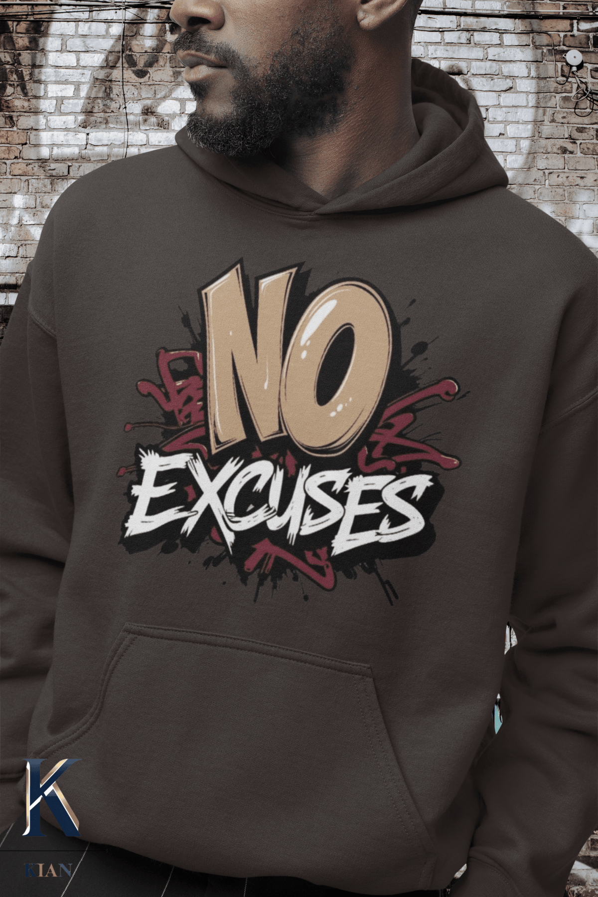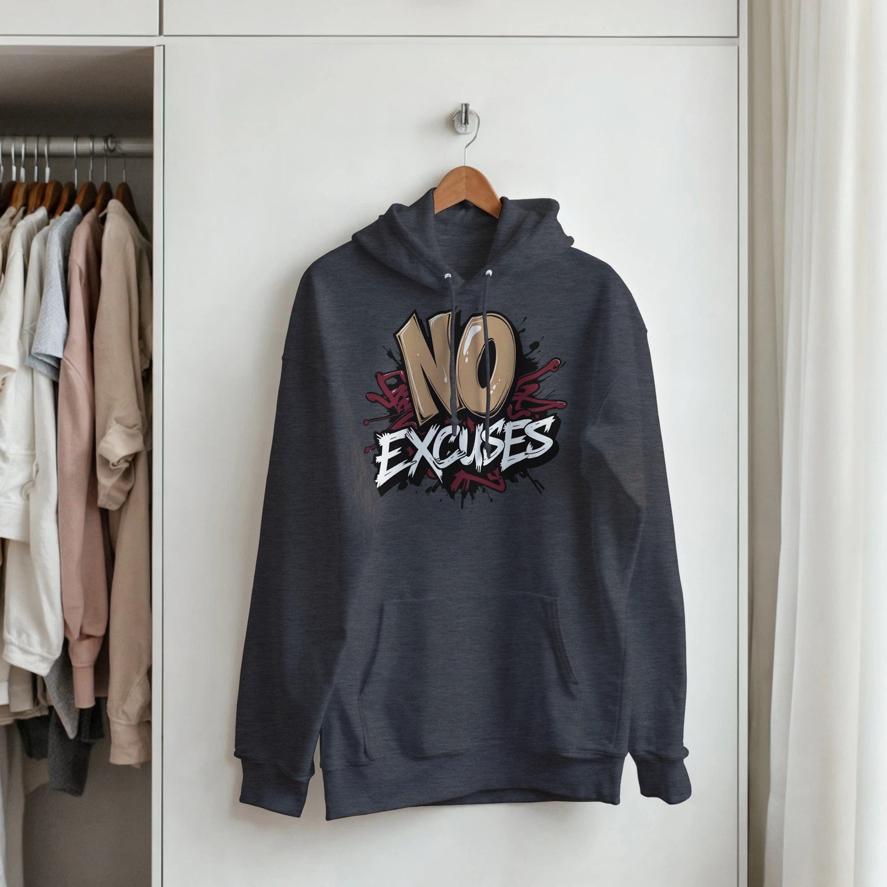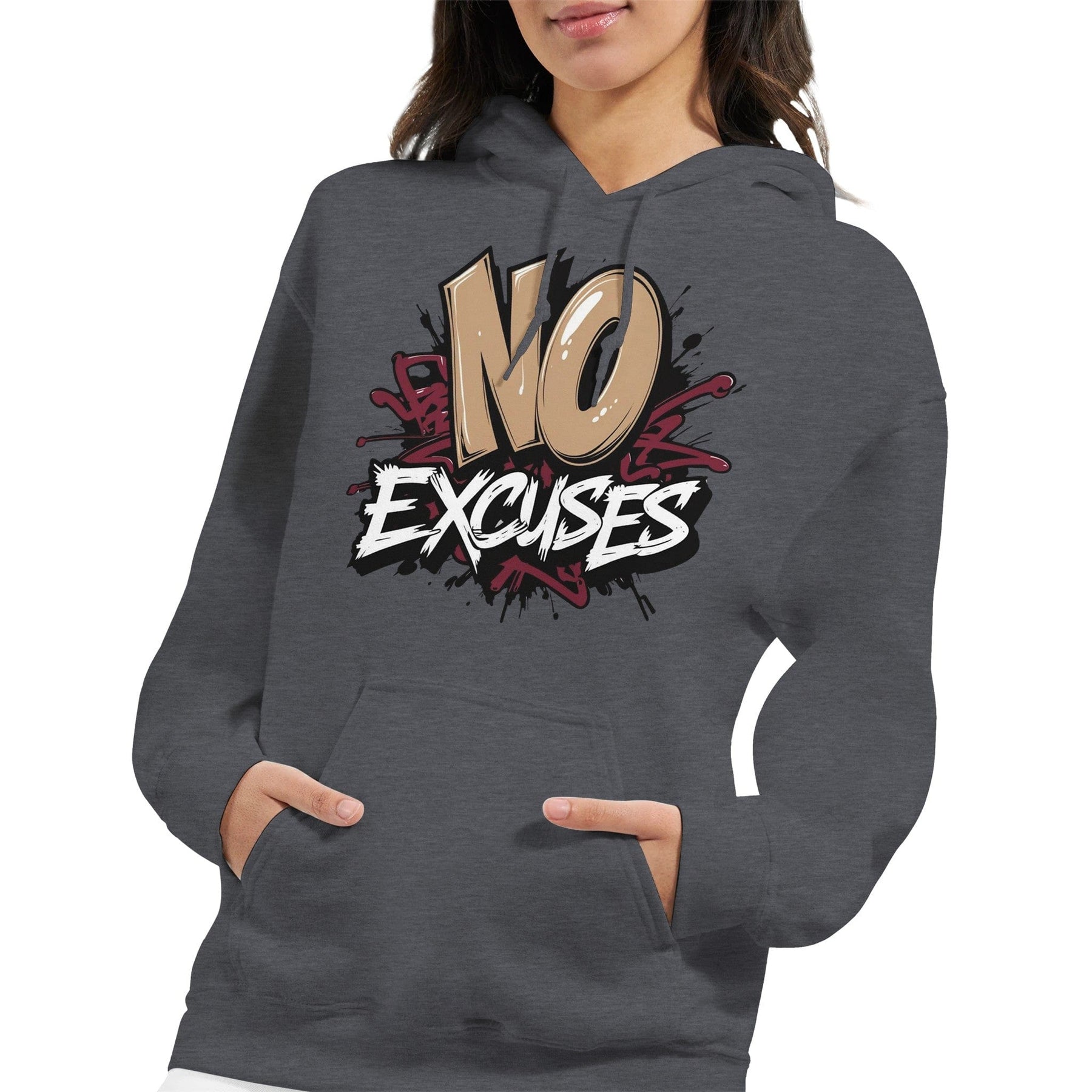 With its "No Excuses" slogan emblazoned across the chest, this hoodie is more than just a fashion statement - it's a daily reminder to stay focused and determined. The motivational message combined with the edgy graffiti artwork sets this hoodie apart from the rest, making it the perfect choice for those who want to stand out from the crowd.