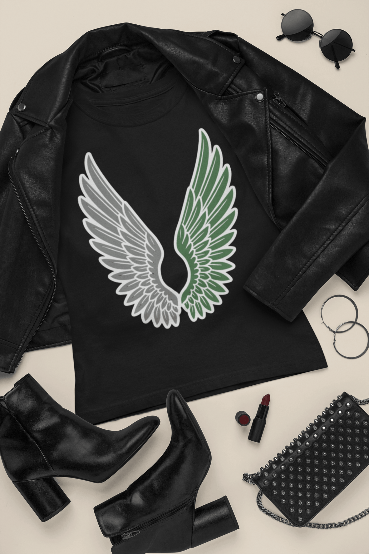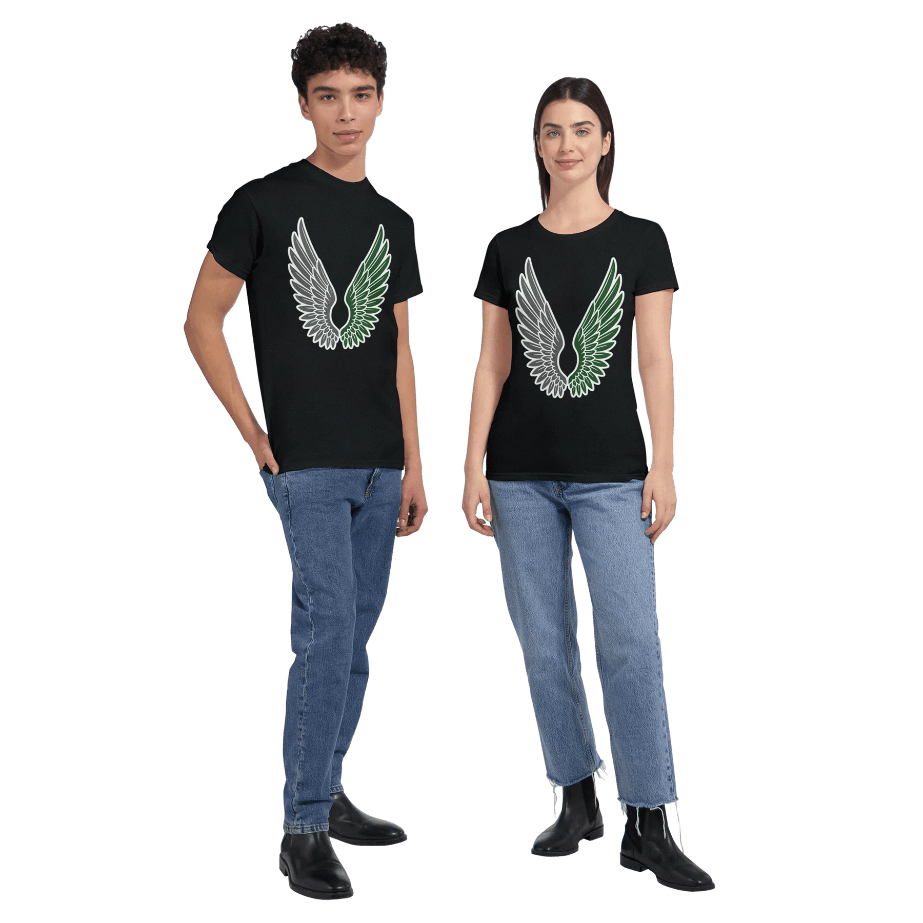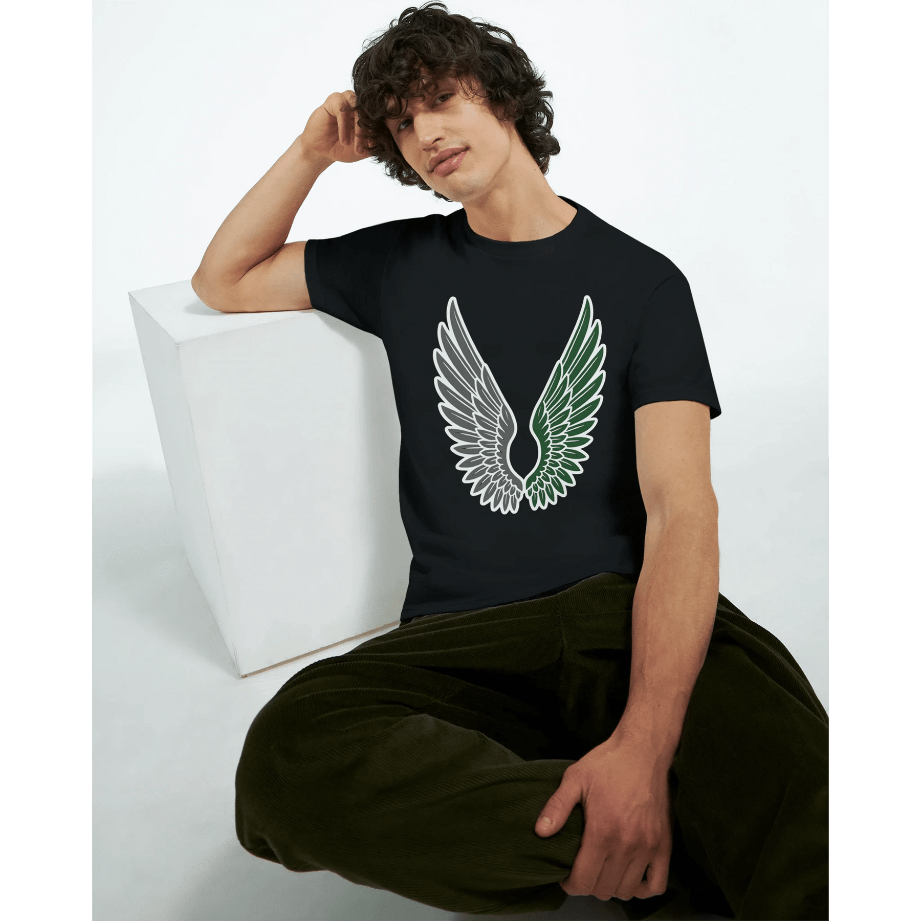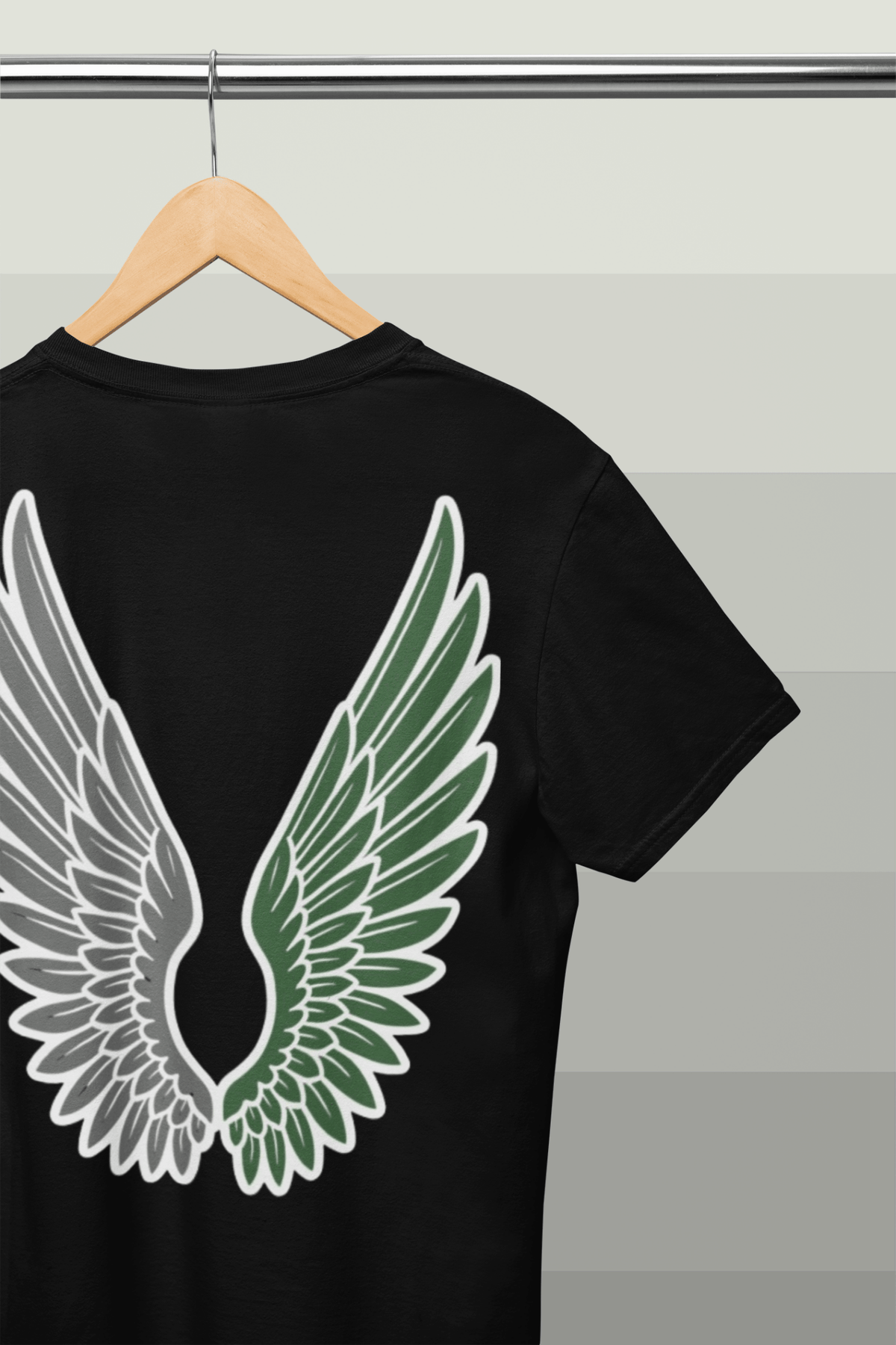 This minimalist angel wings T-shirt features a clean, modern feather design that symbolizes freedom, hope, and transformation. The bold wing graphic—half in white and half in green—creates a striking look that’s effortlessly cool and meaningful.
