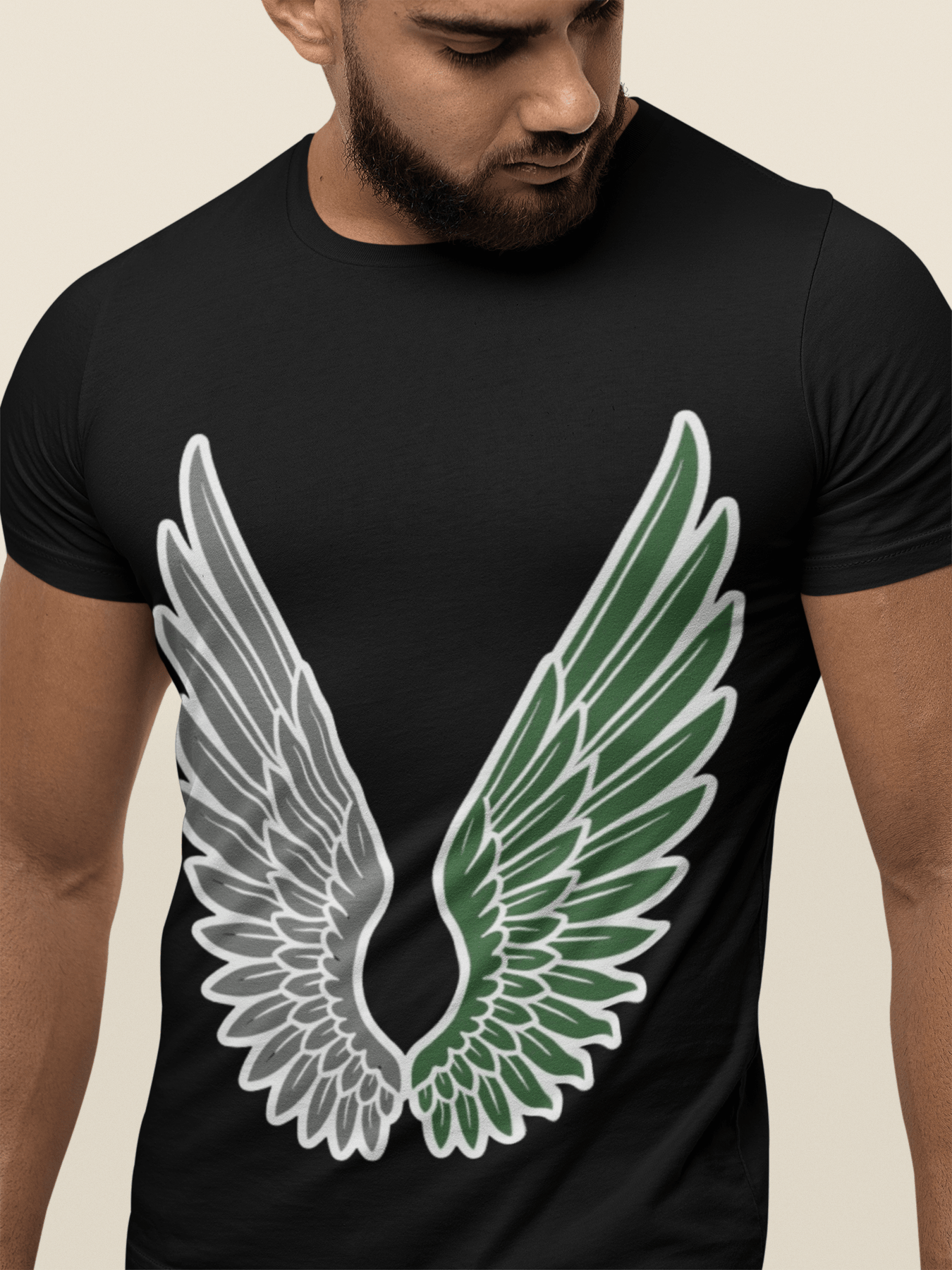 Spread your wings and soar in style with this bold dual-tone wing design, where strength meets symmetry. Featuring a vibrant pairing of green and silver feathers, this artwork embodies balance, freedom, and forward motion—perfect for those who rise above challenges.