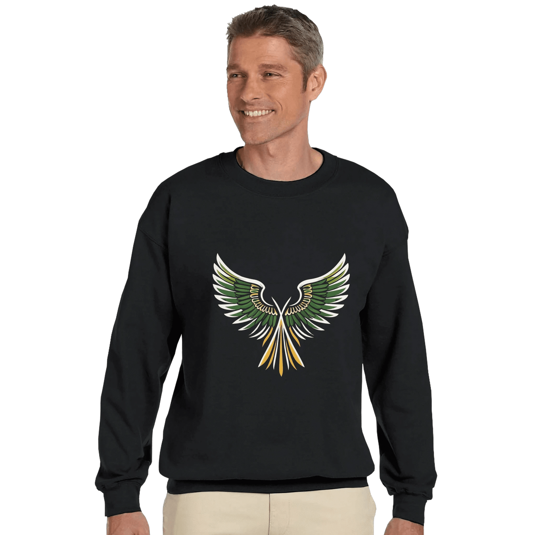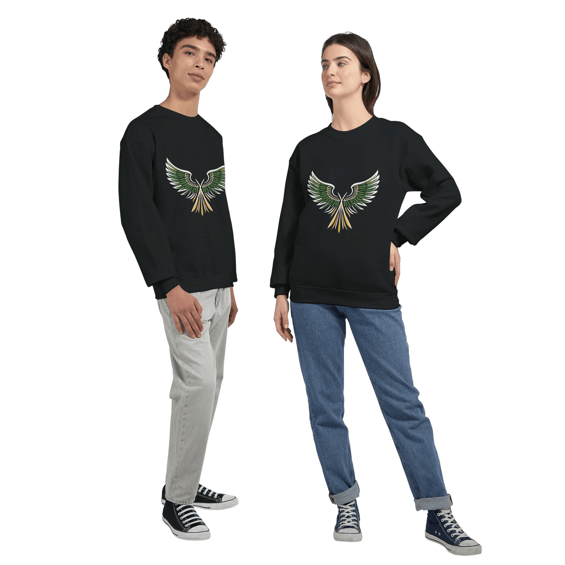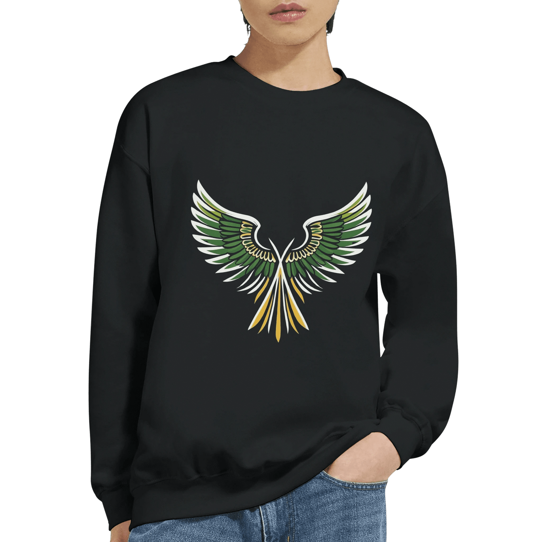 Unleash your bold style with the Rising Wings Graphic Sweatshirt, featuring a striking green-and-gold wing design that symbolizes freedom, energy, and confidence. This vibrant artwork pops against the sleek black background, making it a perfect statement piece for casual wear or streetwear looks.