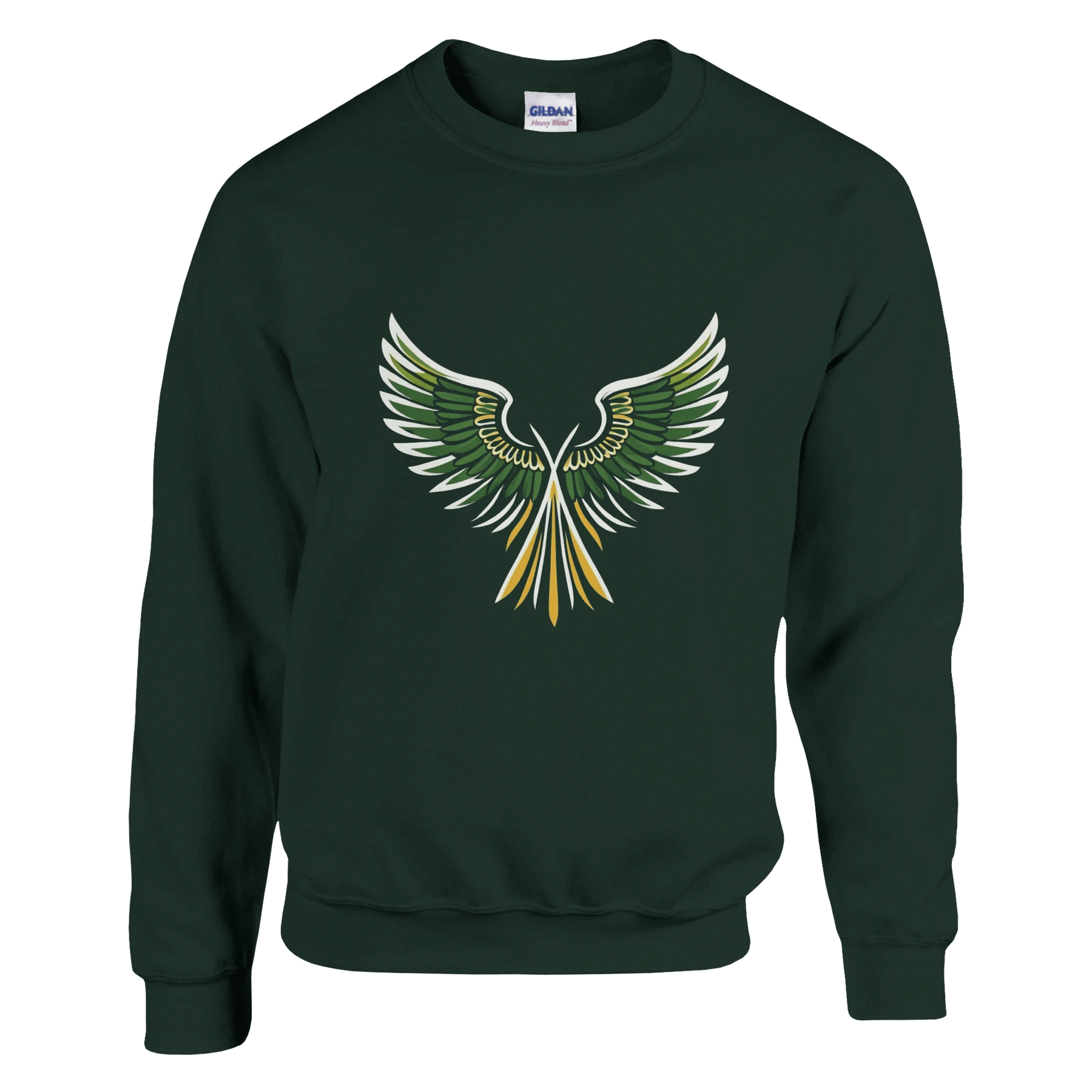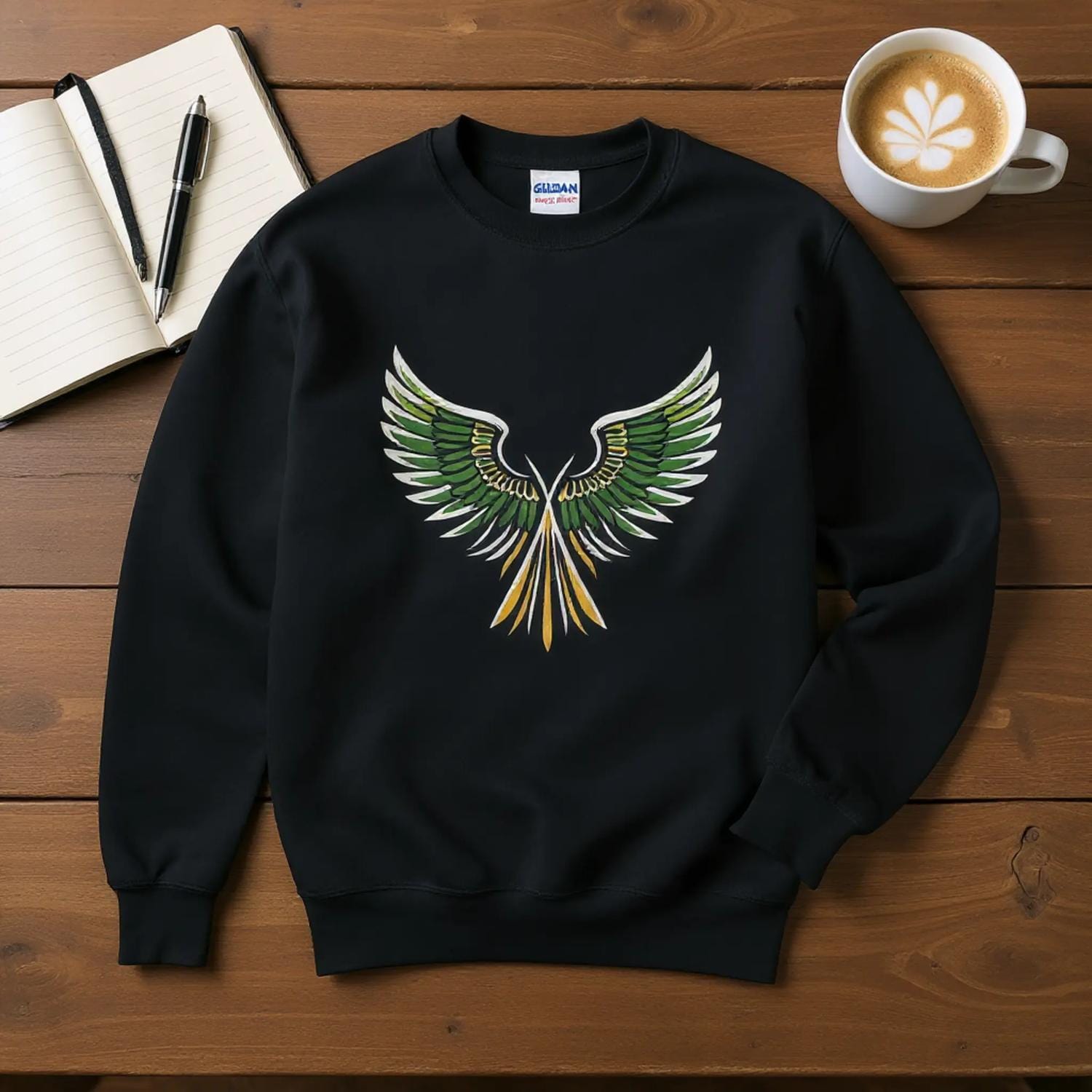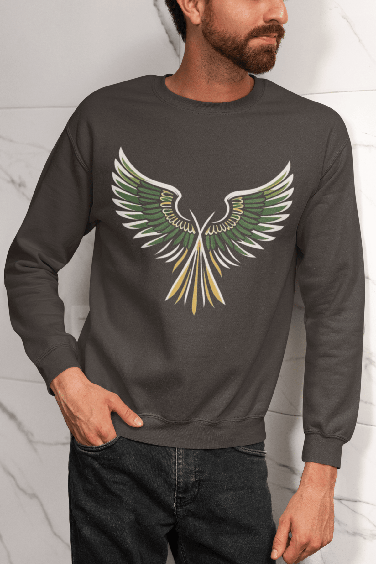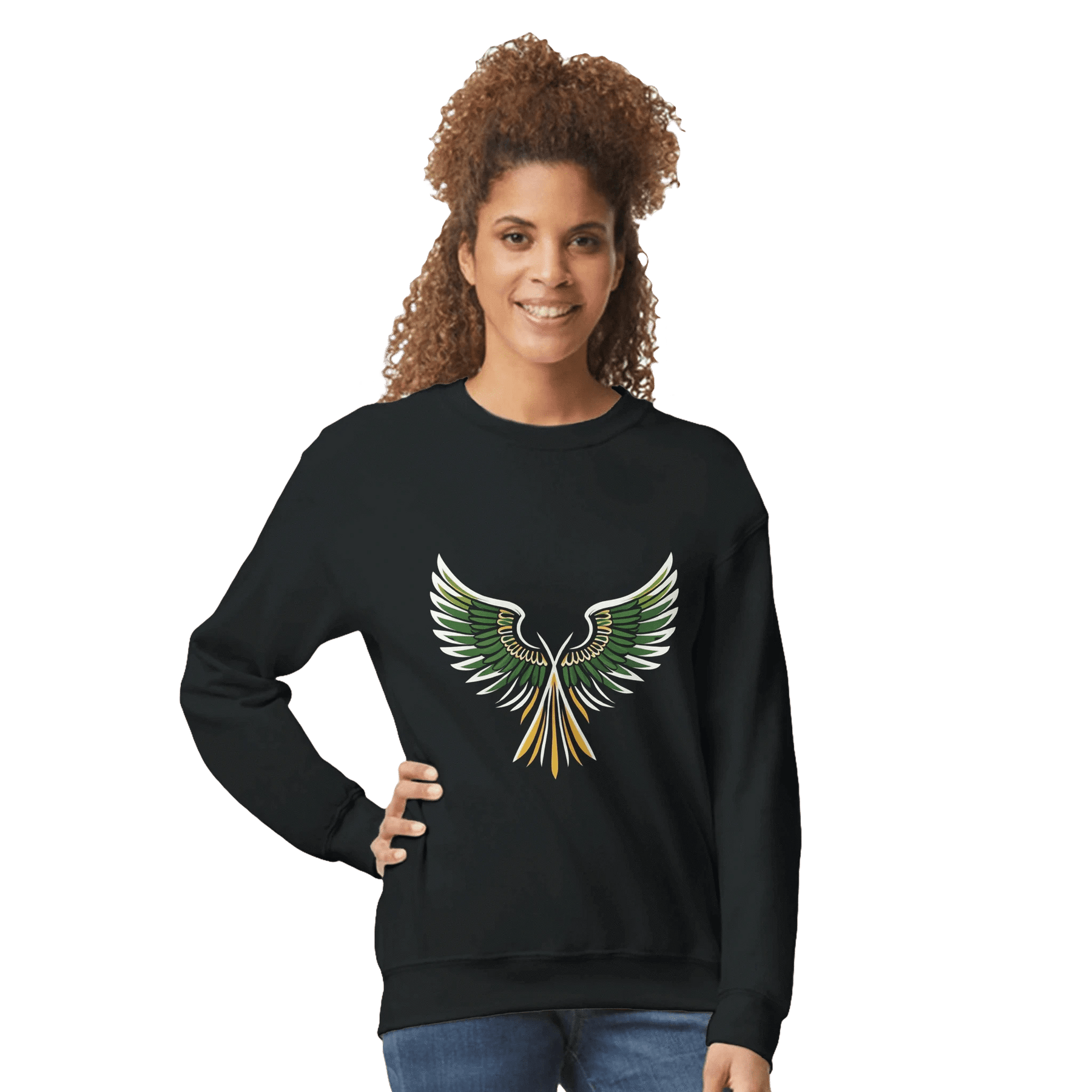 Unleash your bold style with the Rising Wings Graphic Sweatshirt, featuring a striking green-and-gold wing design that symbolizes freedom, energy, and confidence. This vibrant artwork pops against the sleek black background, making it a perfect statement piece for casual wear or streetwear looks.